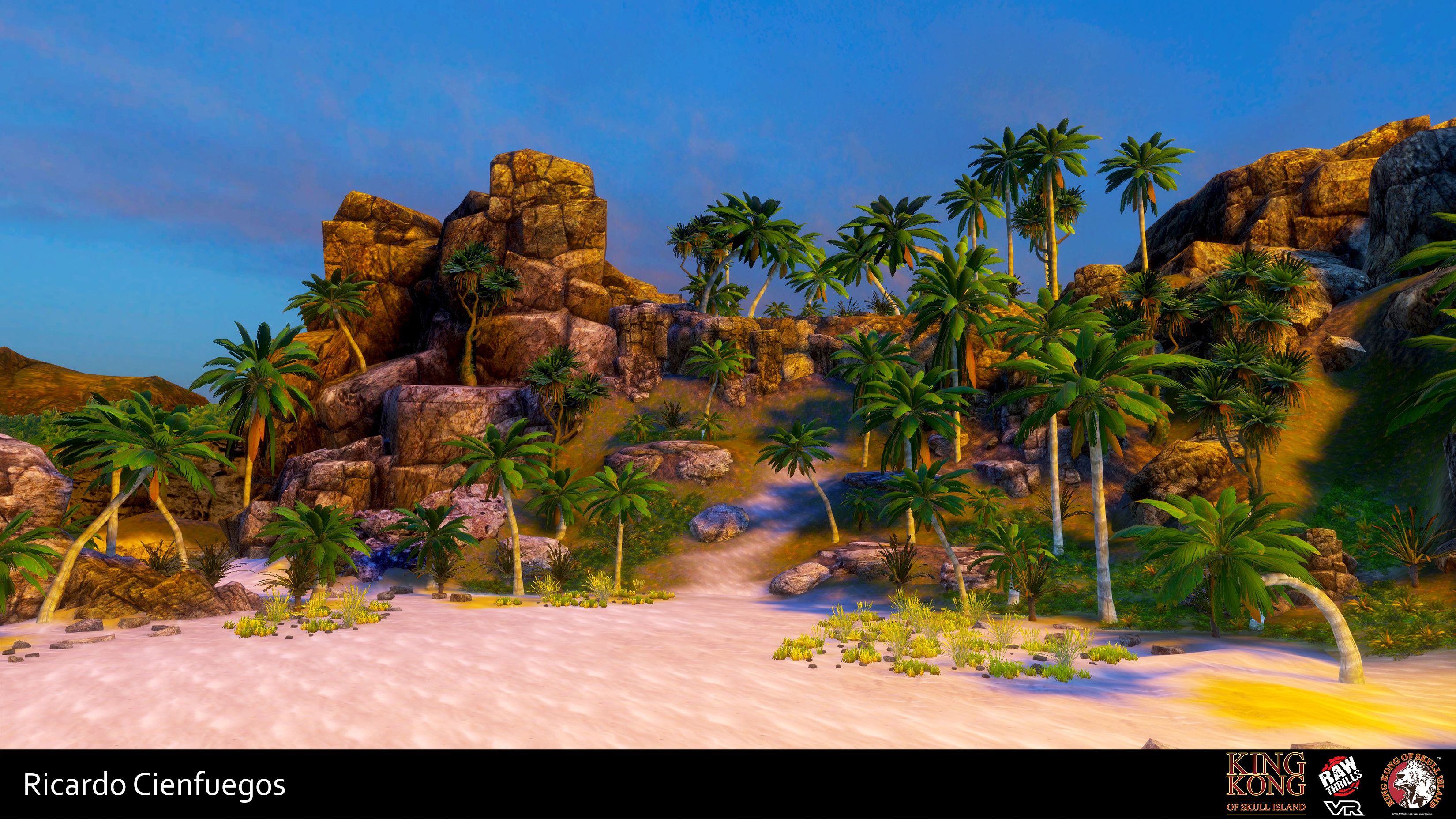I designed this level to be a descent from shallow waters with bright corals and white sandy bottoms. Where the friendliest of aquatic species interacted with the player. Progression was shown with color shifts into a dark ocean abyss where larger sea creatures roamed. Player pathing was based on changes in elevation and descending from the epipelagic zone to a bioluminescent hadalpelagic zone. Using references of our oceans and understanding the creatures and their habitats leads to the design of this experience to be memorable and offer more immersion into VR King Kong.